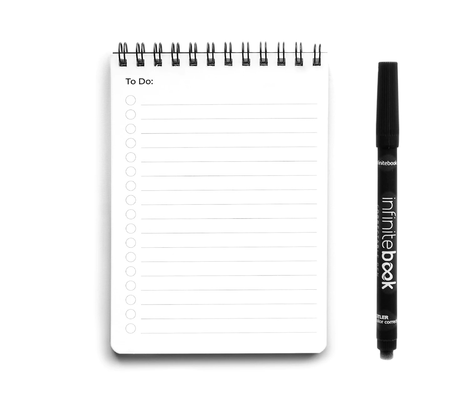 O pack inclui um caderno com 20 páginas e um marcador Infinitebook na cor preta.