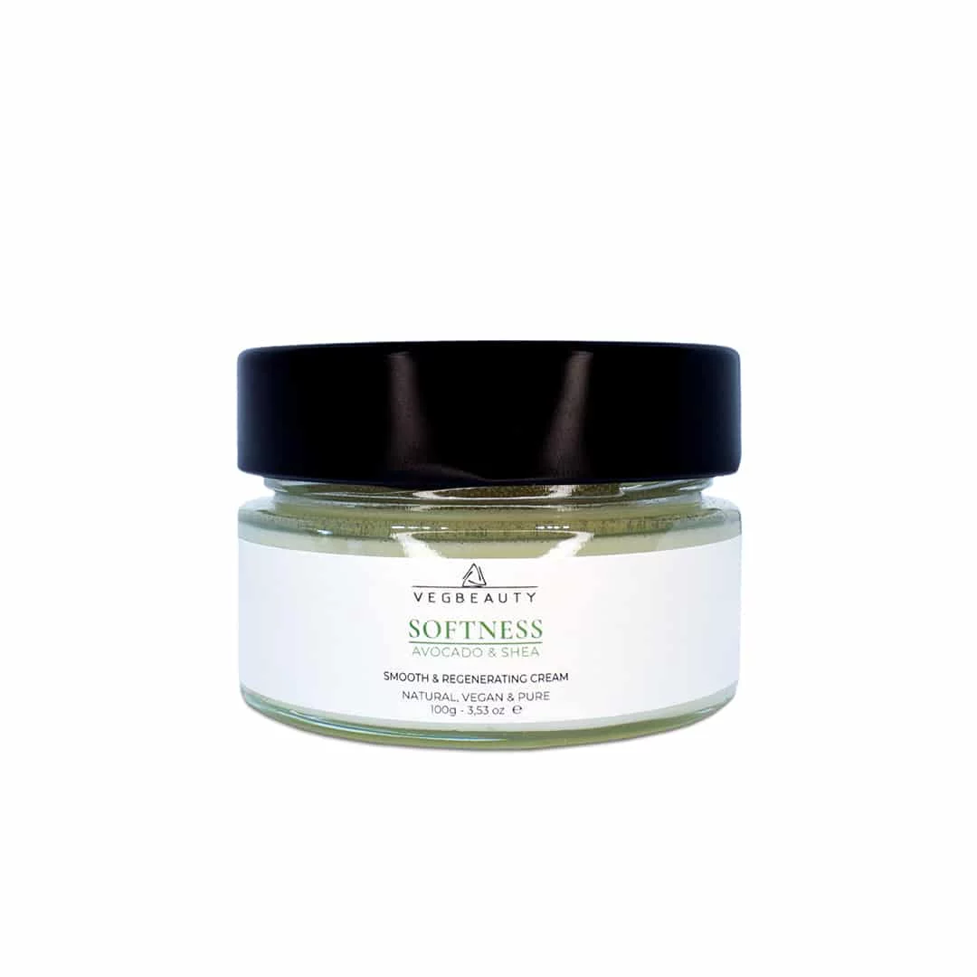O Creme Softness Vegbeauty é formulado com óleo de Abacate e manteiga de Karité possui na sua composição um elevado teor em ácidos gordos essenciais (Omega 6, e Omega 9), carotenóides, insaponificáveis e vitaminas A e E.