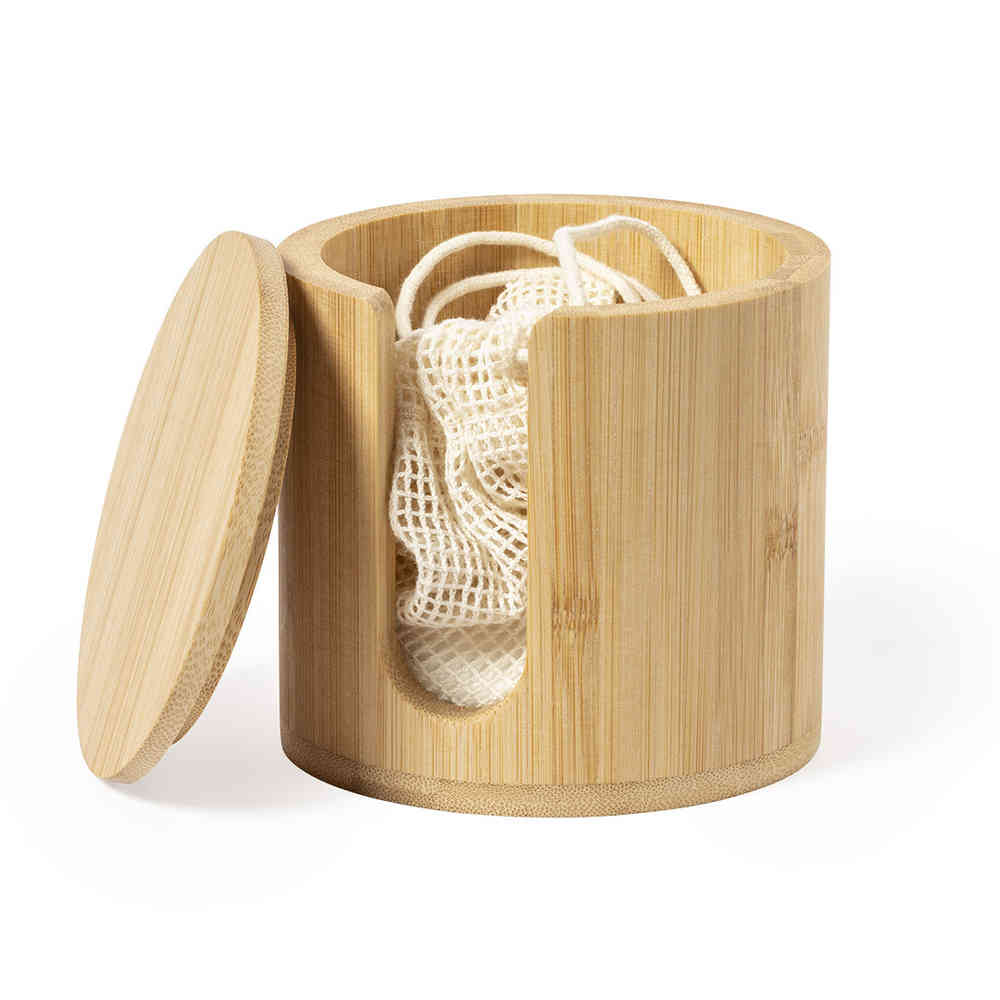 Conjunto composto por um dispensador em bambu, 10 discos reutilizáveis em bambu e algodão  e um saco de rede em algodão para os colocarmos a lavar na nossa máquina de lavar roupa.