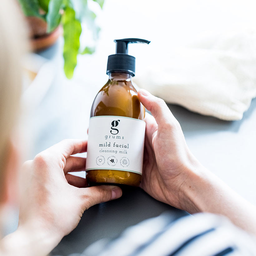 O Leite de limpeza facial Grums remove as impurezas da pele e impede a produção excessiva de sebo.