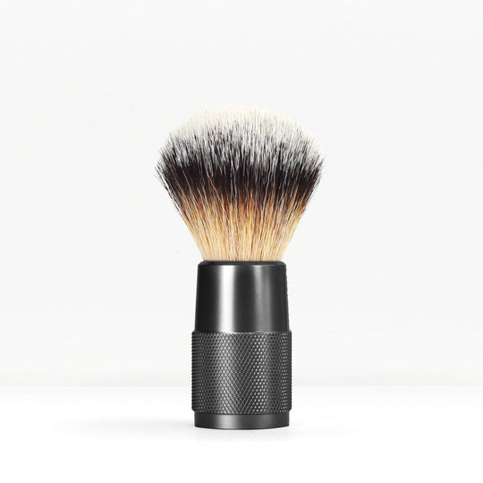 Pincel de barbear preto com cabo de alumínio leve e cerdas de nylon.