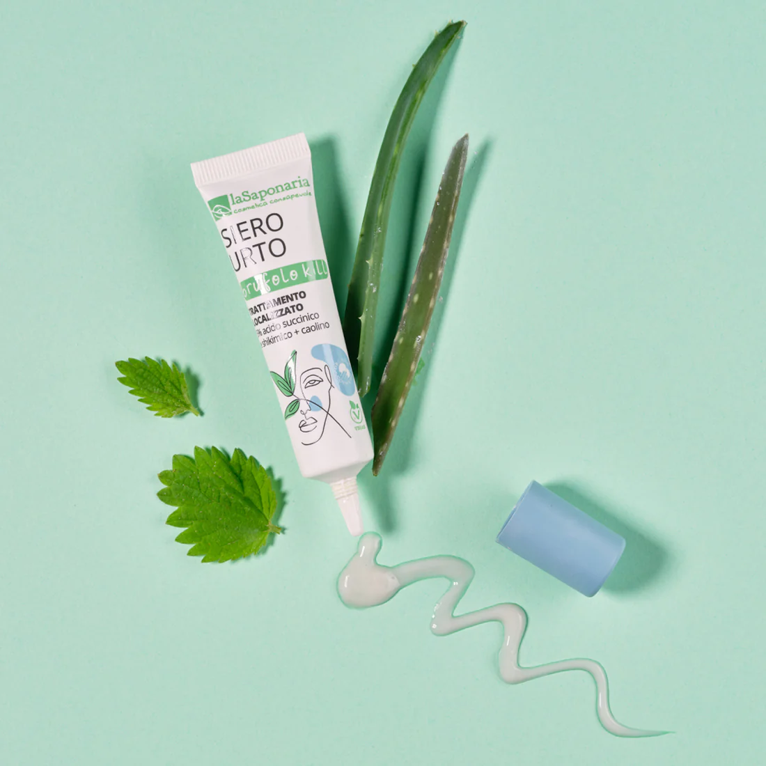 Formulado com uma mistura de ácido succínico e ácido chiquímico, que ajudam a regular a produção de sebo e limitar a sua acumulação nos poros, caulino e argila verde, que secam a borbulha, e vitamina E, chá verde e videira vermelha, com efeito antioxidante e regenerador.