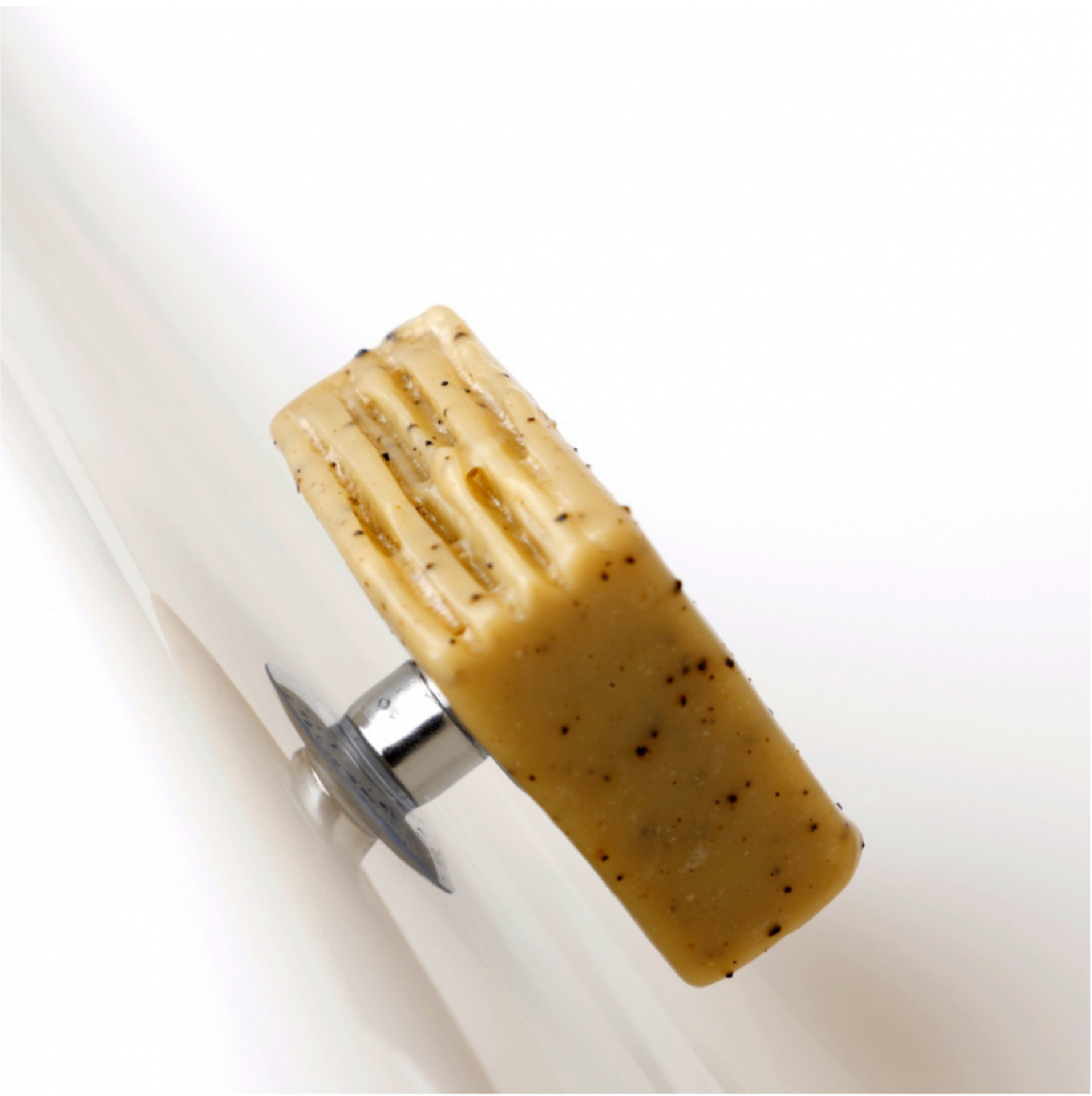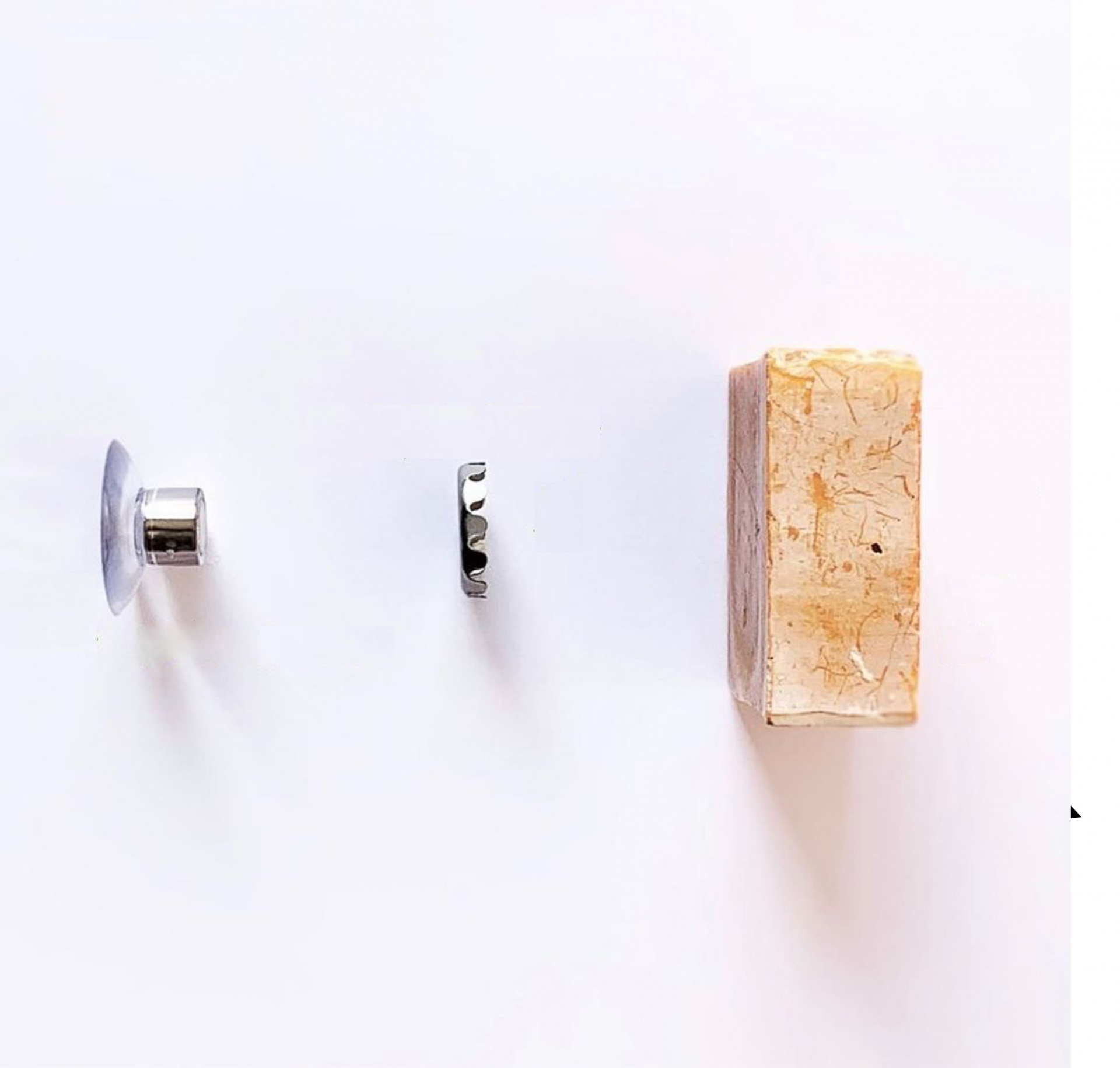 O suporte prende-se ao champô/sabonete através das ‘garras’ que contêm um íman.